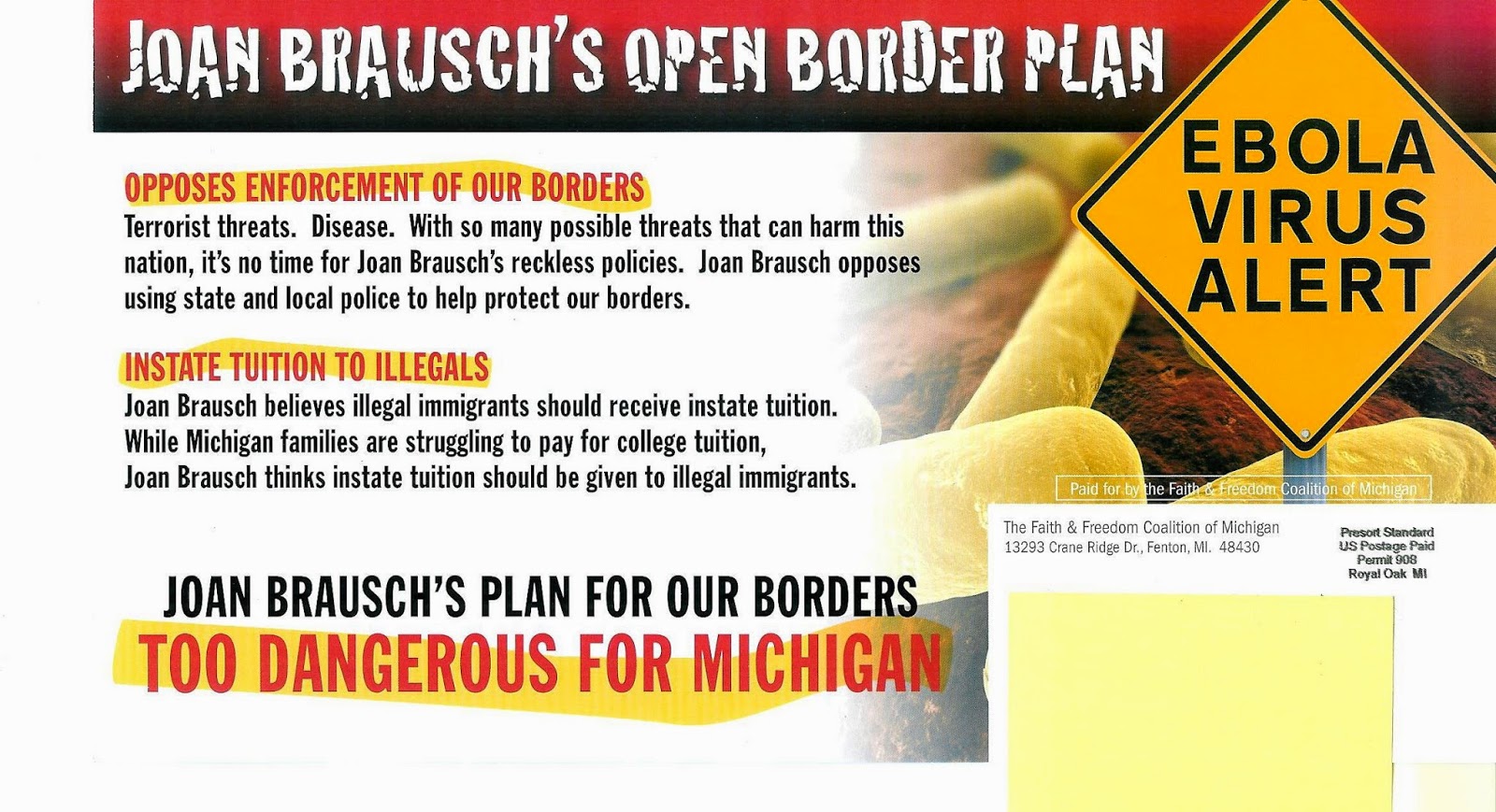 So, folks, let me tell you that I have seen this act before. And believe me, it is an act. When he pulled that stunt about the American Legion with Karl Ieuter, I revisited the politics of the Big Lie again. I am a pacifist, and I have been a member of the American Legion because of my father’s service, so I knew Glenn was making a political mountain out of a mole hill just to scare veterans. And now, according to Glenn’s ads, electing Joan Brausch will turn Michigan’s men gay, get our young women raped, and infest our population with Ebola. I wish I were kidding, but that has been the content of these ridiculous and sensationalist ads.